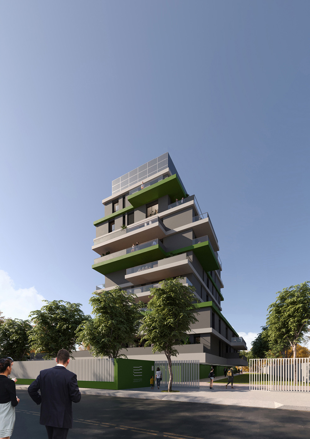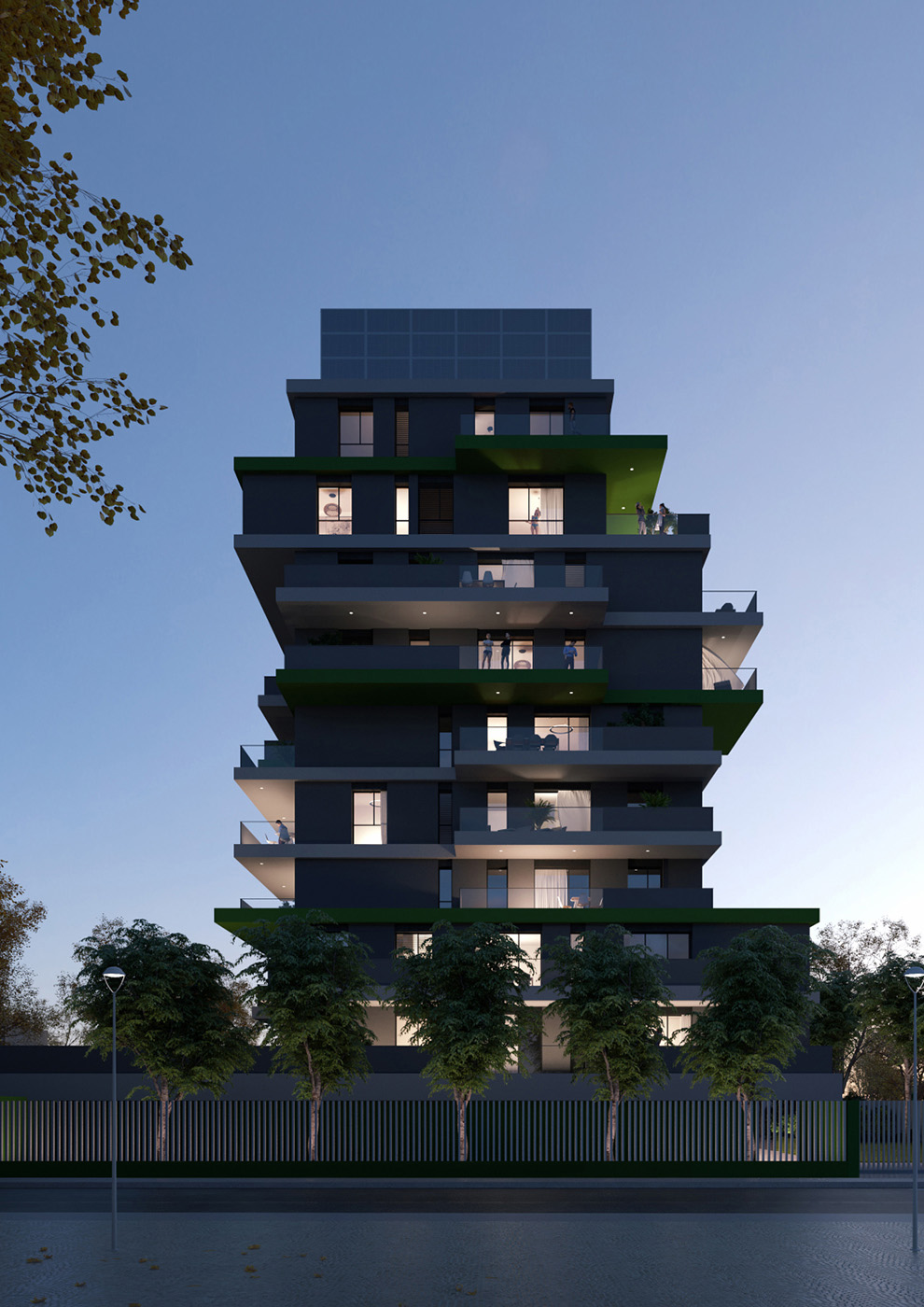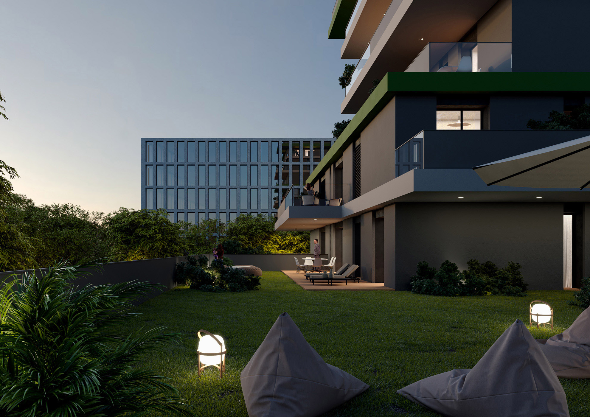 The design strategy is oriented towards overcoming the block typology: through the articulation of the volumes, a dynamic architecture is defined, which integrates the entire functional program and enhances the contingencies. A low single-storey volume develops horizontally hosting the mobility equipment and the common spaces, above which eight floors of residences, developed in height and with a shape that increasingly reduces its size as it rises.