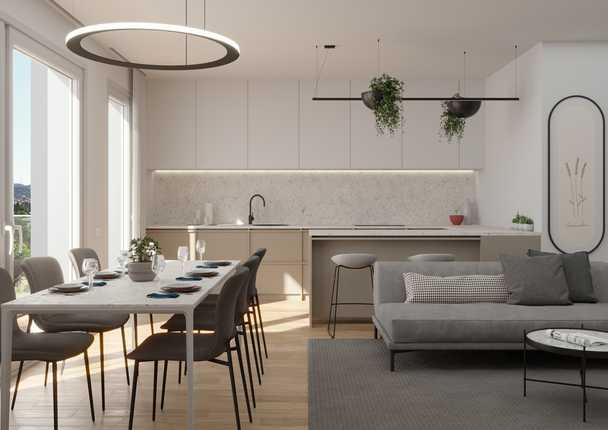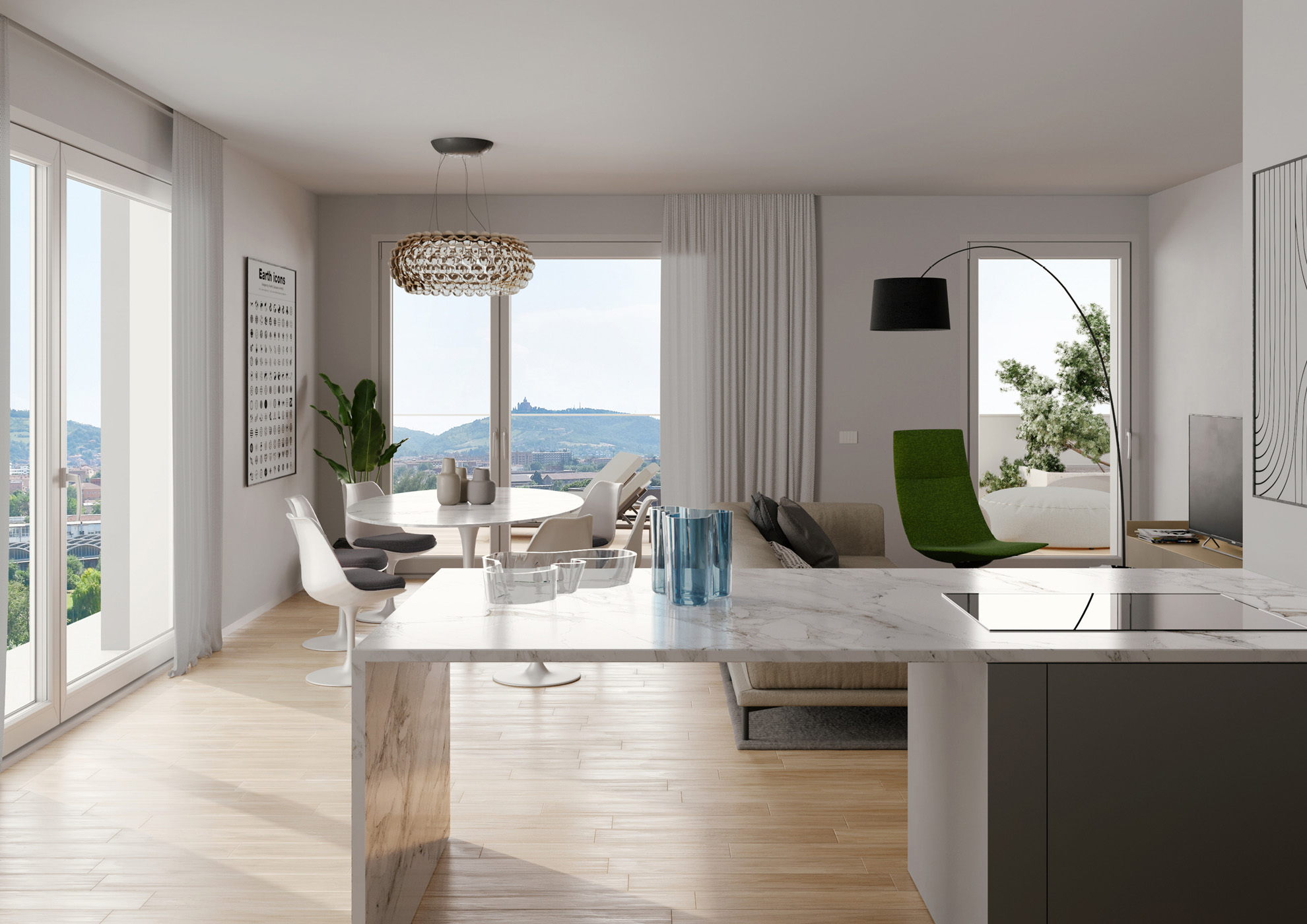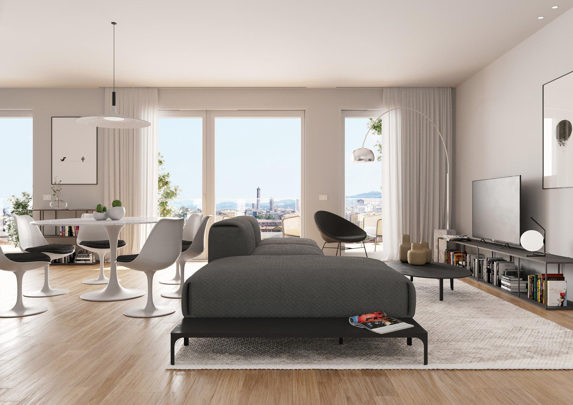 The design strategy is oriented towards overcoming the block typology: through the articulation of the volumes, a dynamic architecture is defined, which integrates the entire functional program and enhances the contingencies. A low single-storey volume develops horizontally hosting the mobility equipment and the common spaces, above which eight floors of residences, developed in height and with a shape that increasingly reduces its size as it rises.