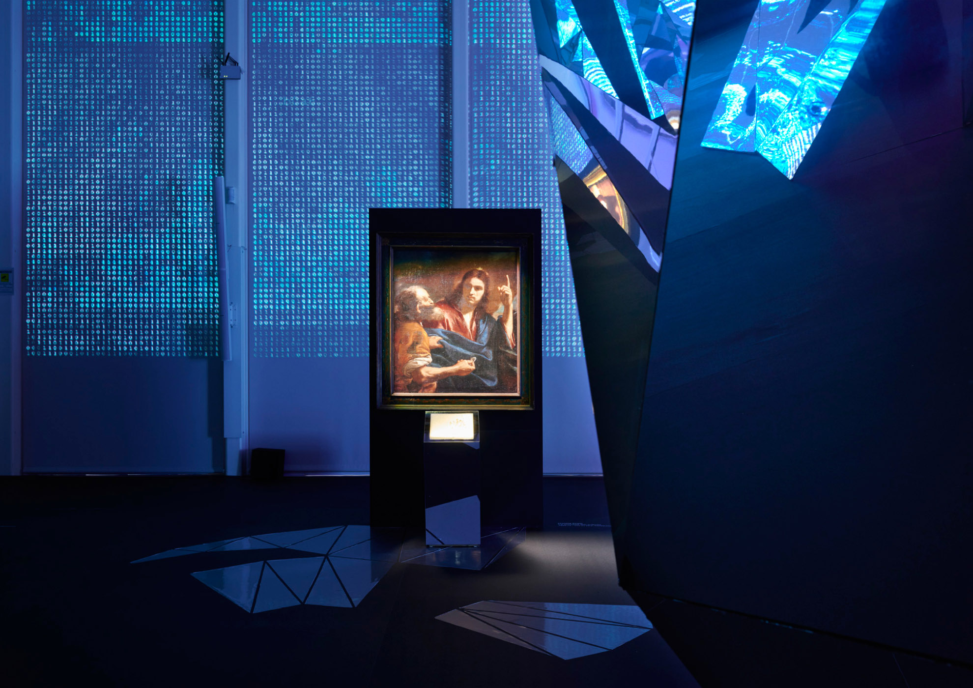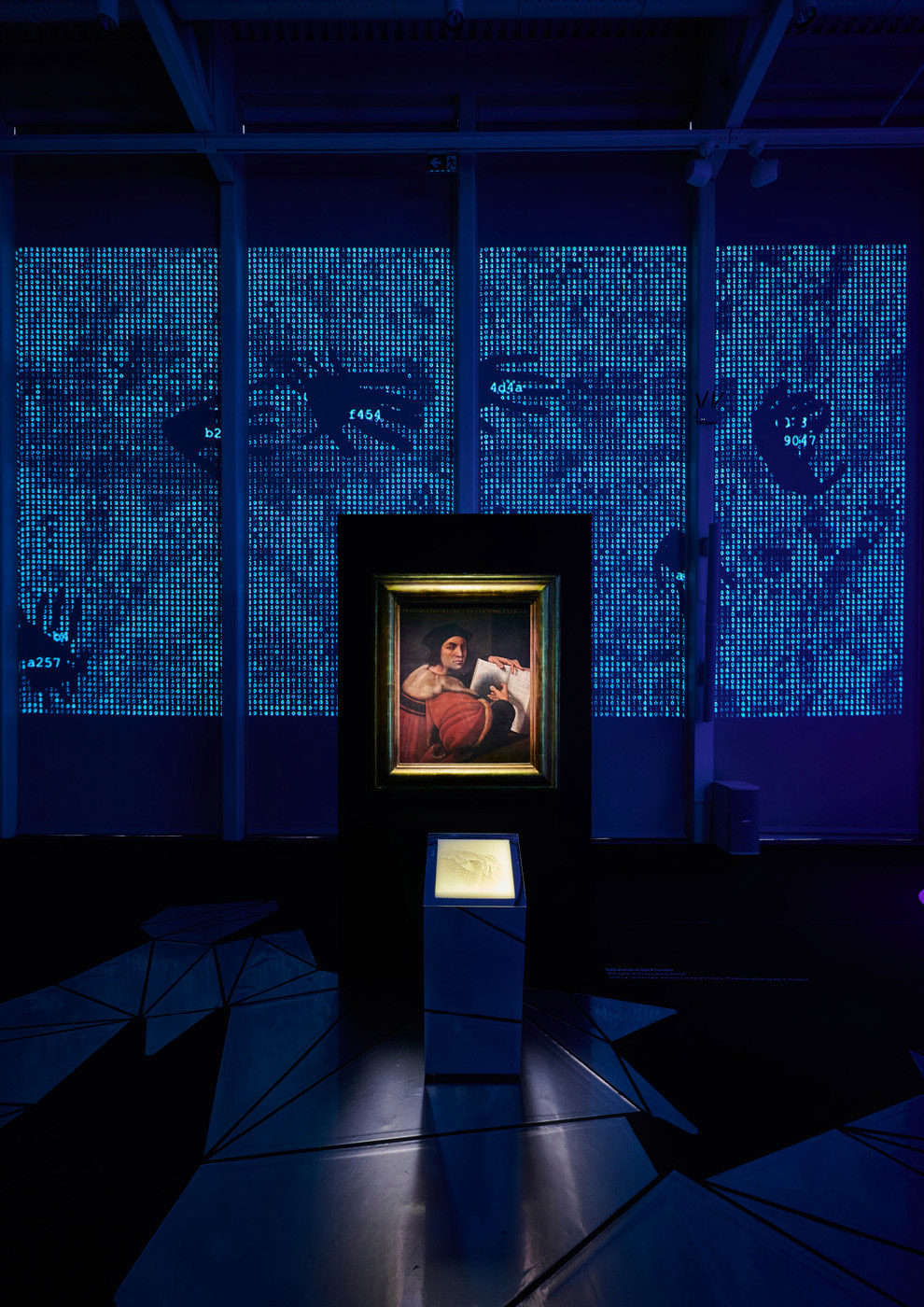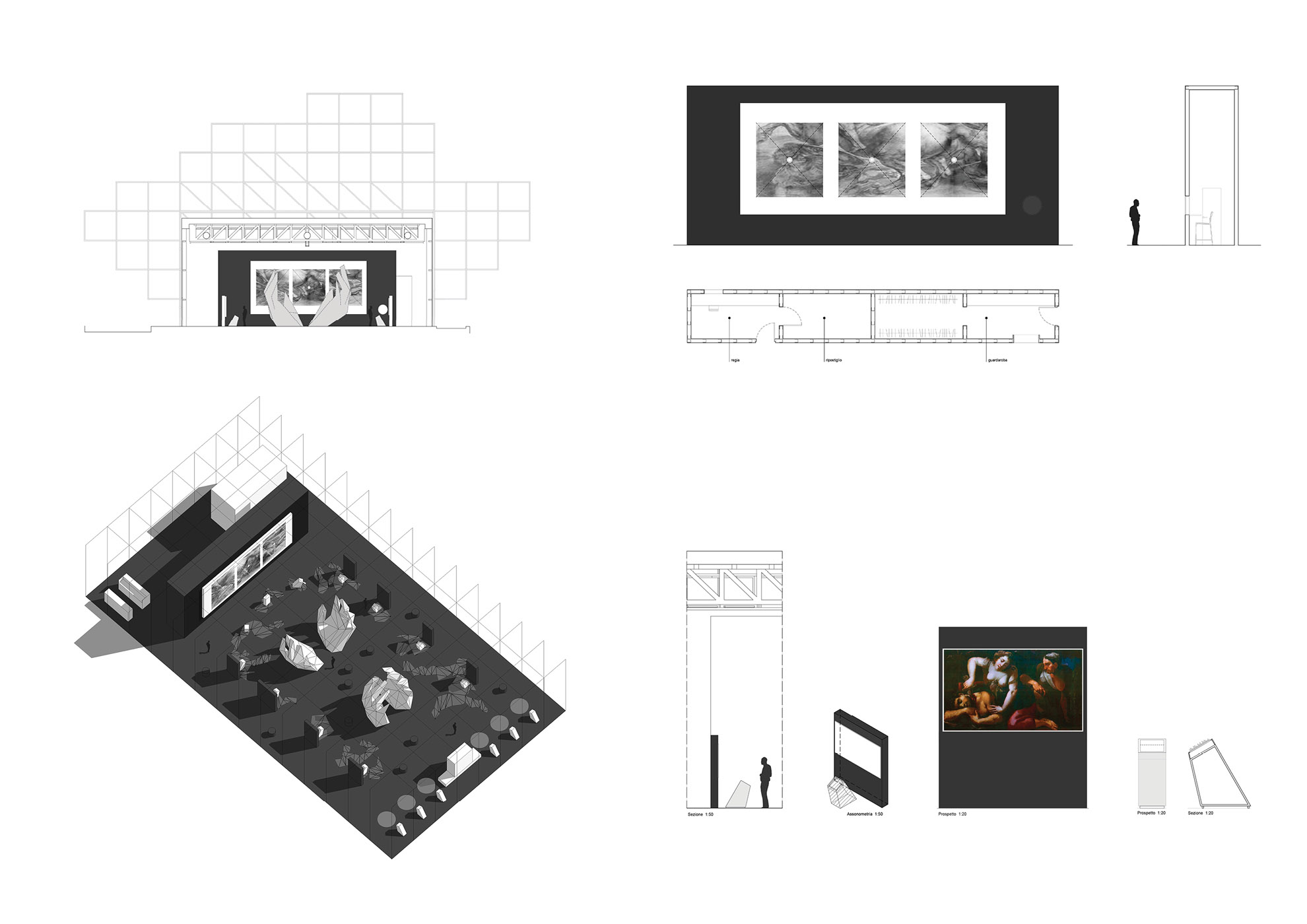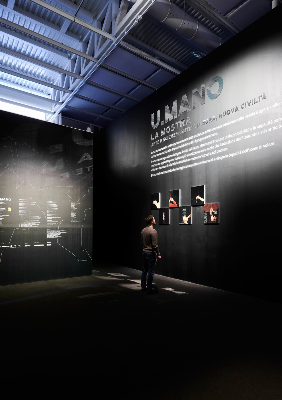 L’allestimento della mostra è immaginato come una architettura parlante ove la definizione dello spazio è determinata dal posizionamento delle opere, che sostituiscono la struttura: esse diventano sia muri, sia pilastri, ma anche supporto sul quale sovrascrivere il contenuto. Lo spazio è immaginato come un’immateriale architettura del sapere che come un libro intende registrare storia e futuro smaterializzandosi in ogni direzione.
