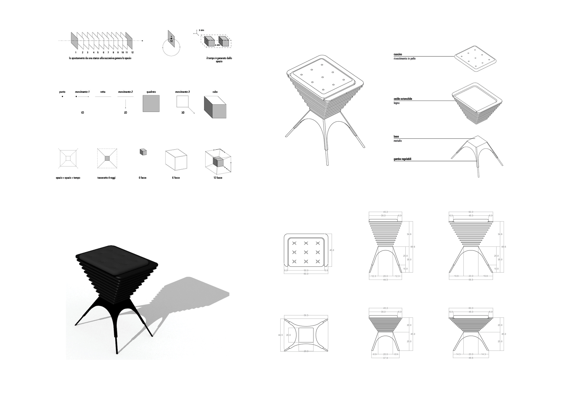 The stool is ideally composed of two elements, the extendable seat and the legs that support it. It maintains a minimal character, underlined by the emptying of the lower part, which becomes essential. The project provides variable height adjustment, with the possibility of adapting the inclination of the seat. The structure is made up of telescopic rings with rigid positioning, with a bellows safety closure between the mobile rings, equal to a number of 12.