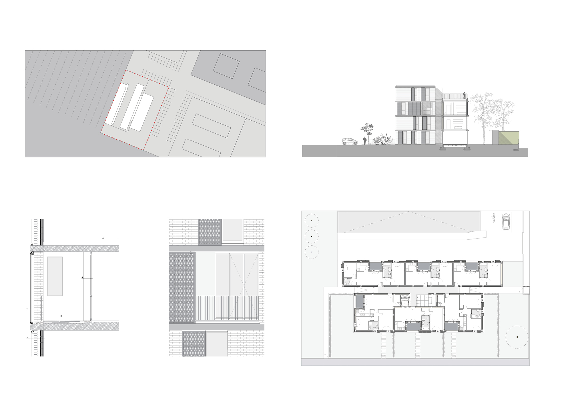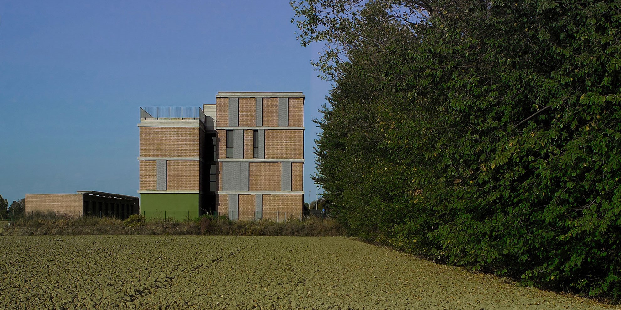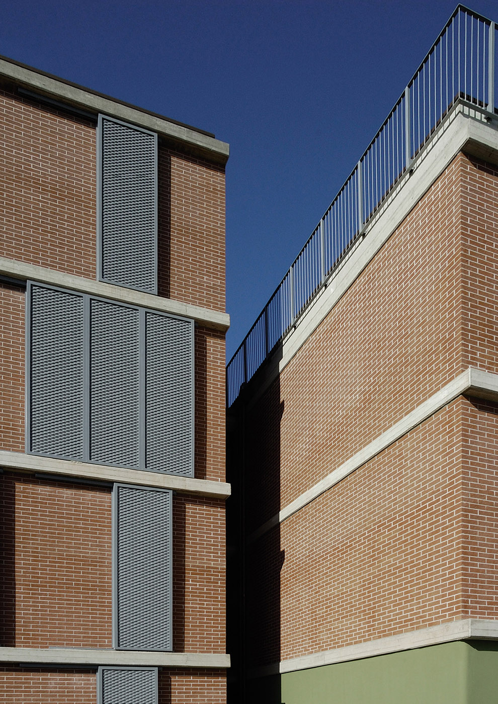 L’edificio prende forma attraverso la scomposizione in rigorosi volumi in laterizio, tra i quali trovano luce i percorsi interni di distribuzione. La composizione architettonica è caratterizzata da un sistema di ante scorrevoli oscuranti realizzate in acciaio stirato, disposte liberamente sullo spartito dato dai marcapiani in cemento armato.