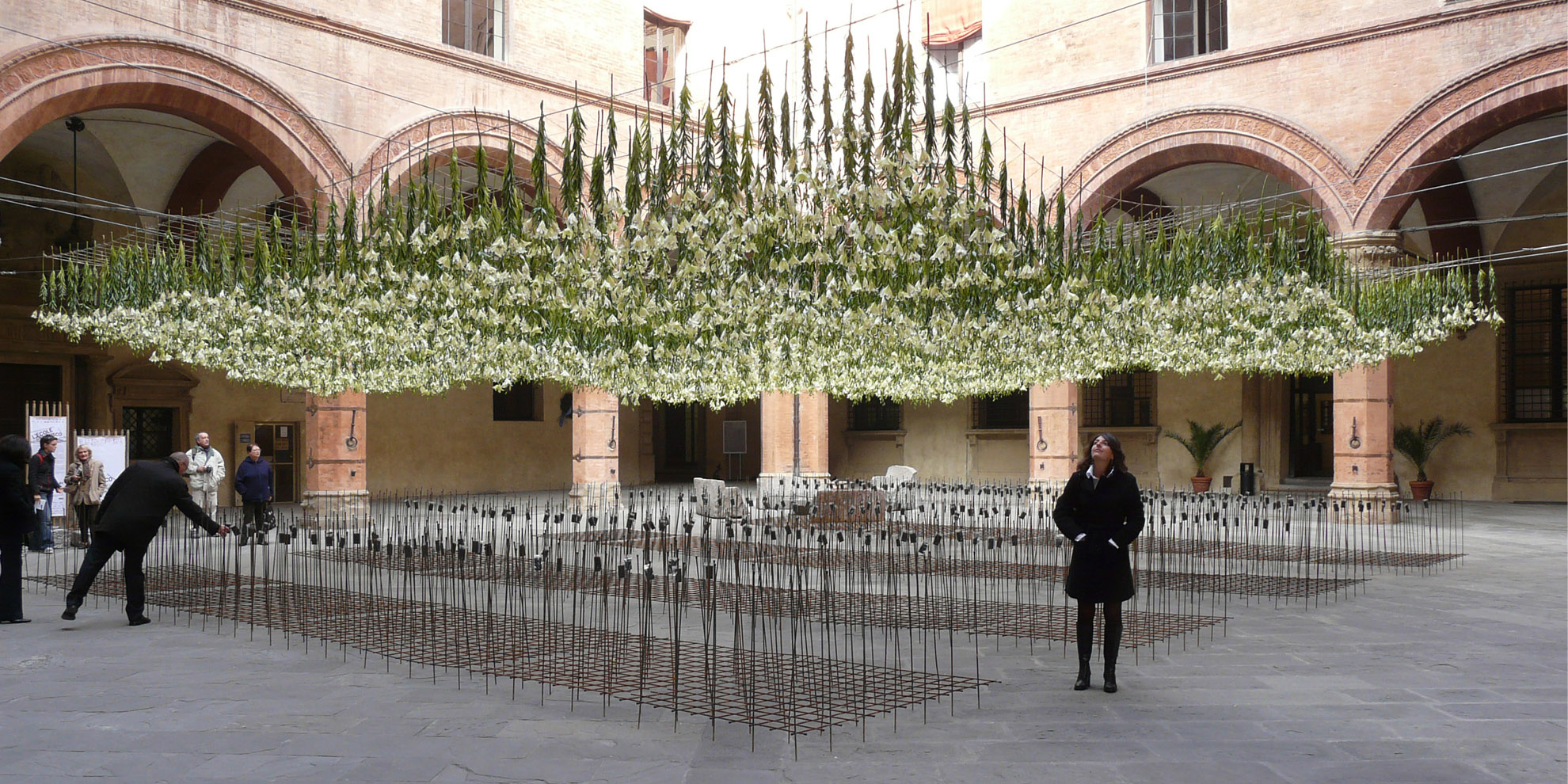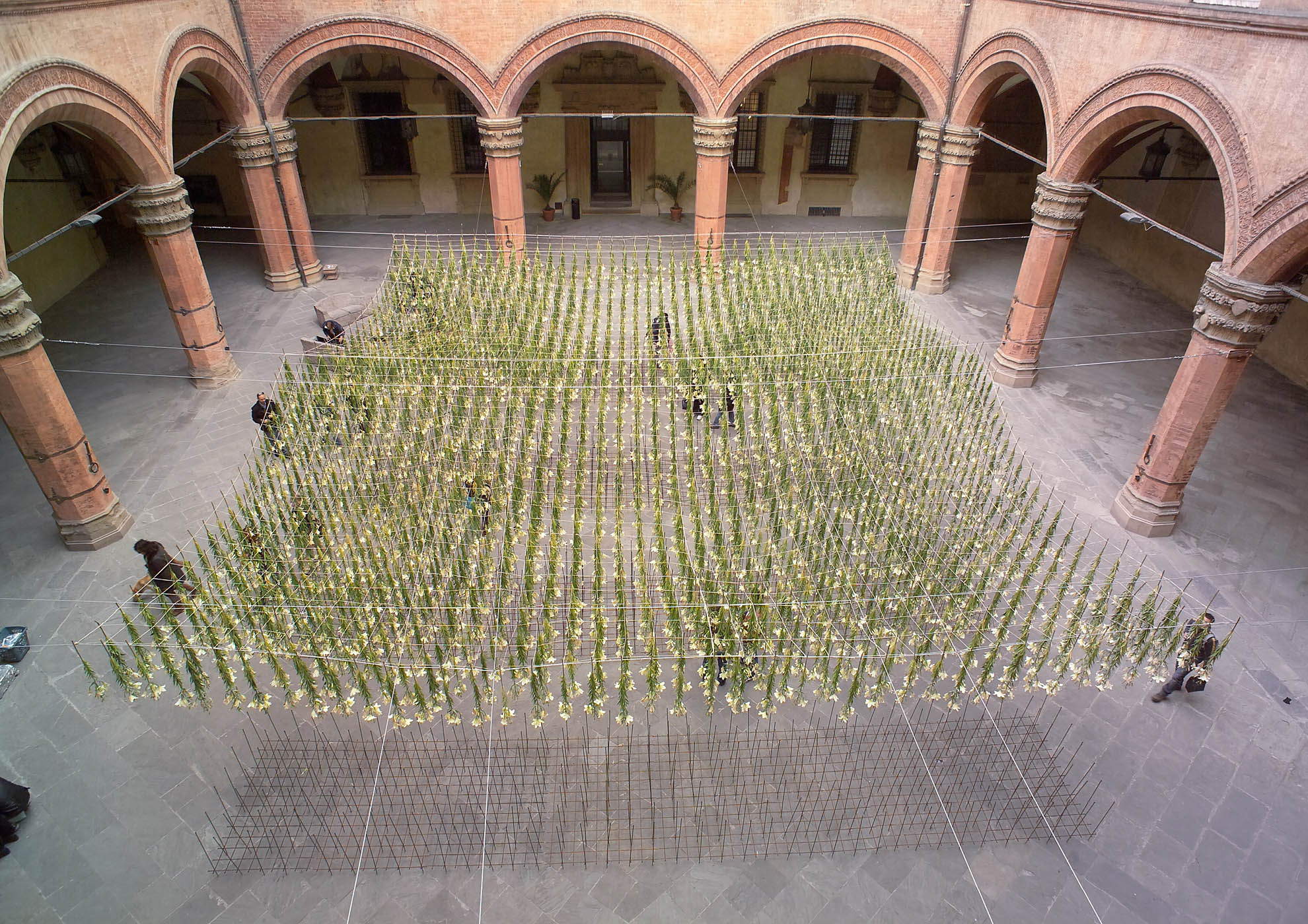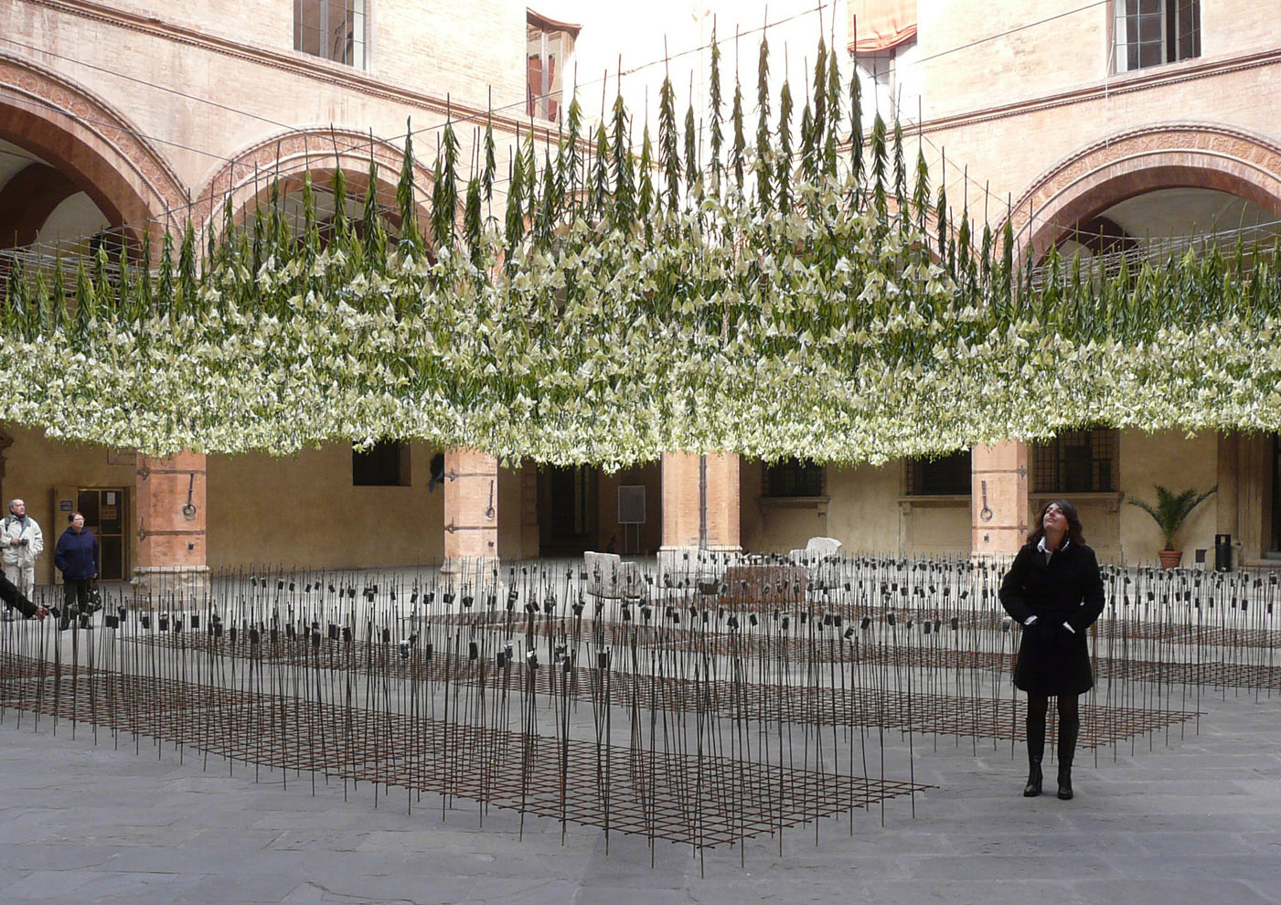 In/odore offers an olfactory experience and displays the natural/smell-artificial/odourless dichotomy. While trying to emulate Nature, man often produces aseptic simulacra. In the installation a natural garden (utopia) is projected towards the sky, while on the ground an artificial garden unfolds (reality).