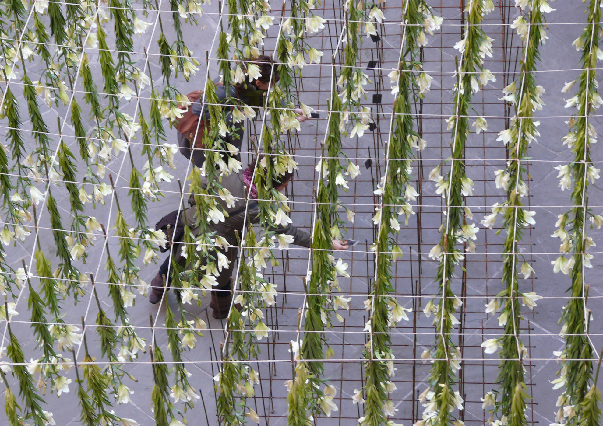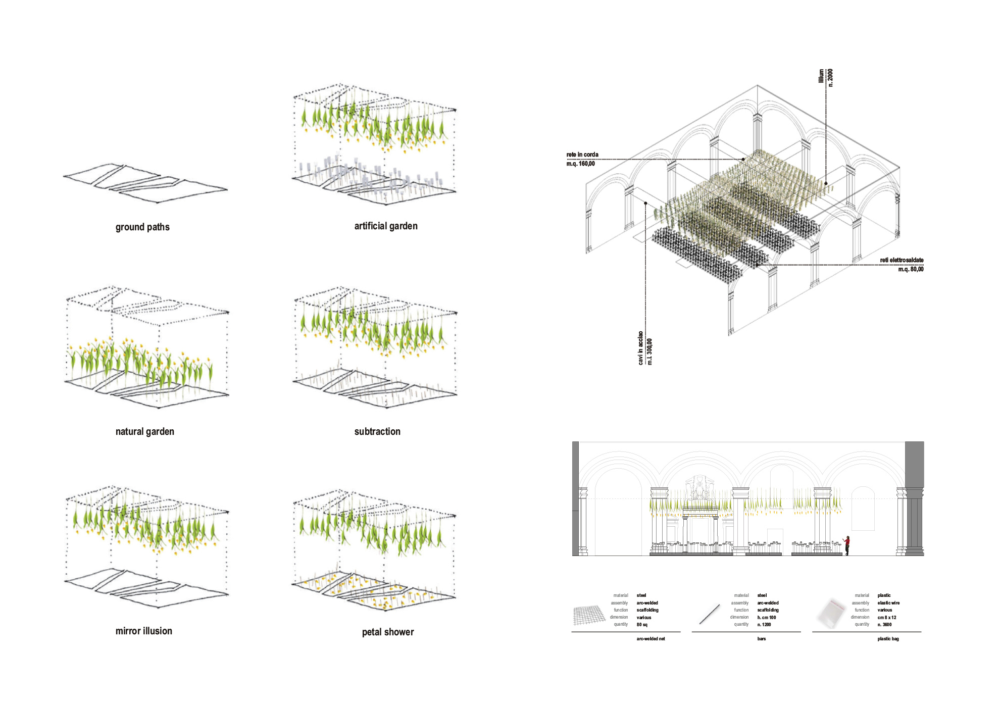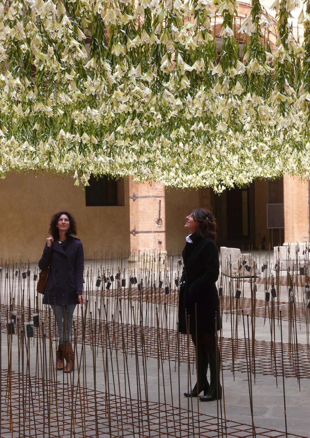 In/odore offers an olfactory experience and displays the natural/smell-artificial/odourless dichotomy. While trying to emulate Nature, man often produces aseptic simulacra. In the installation a natural garden (utopia) is projected towards the sky, while on the ground an artificial garden unfolds (reality).