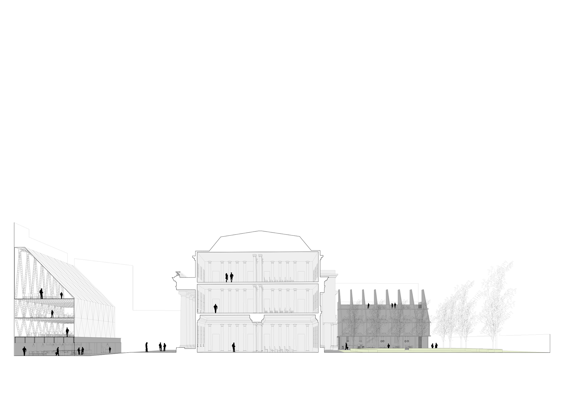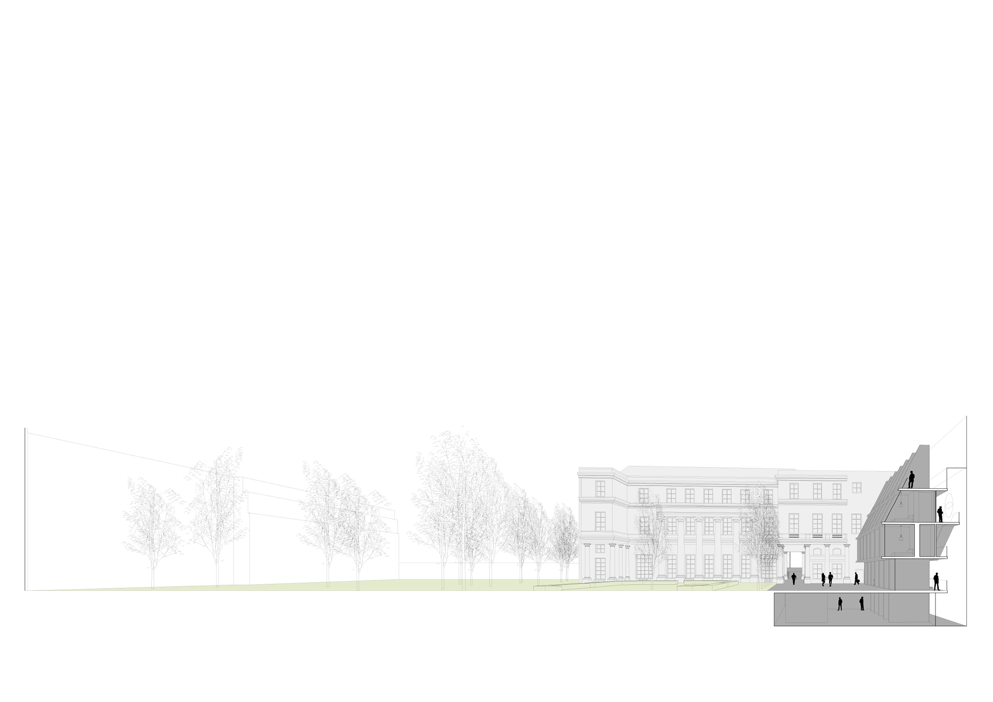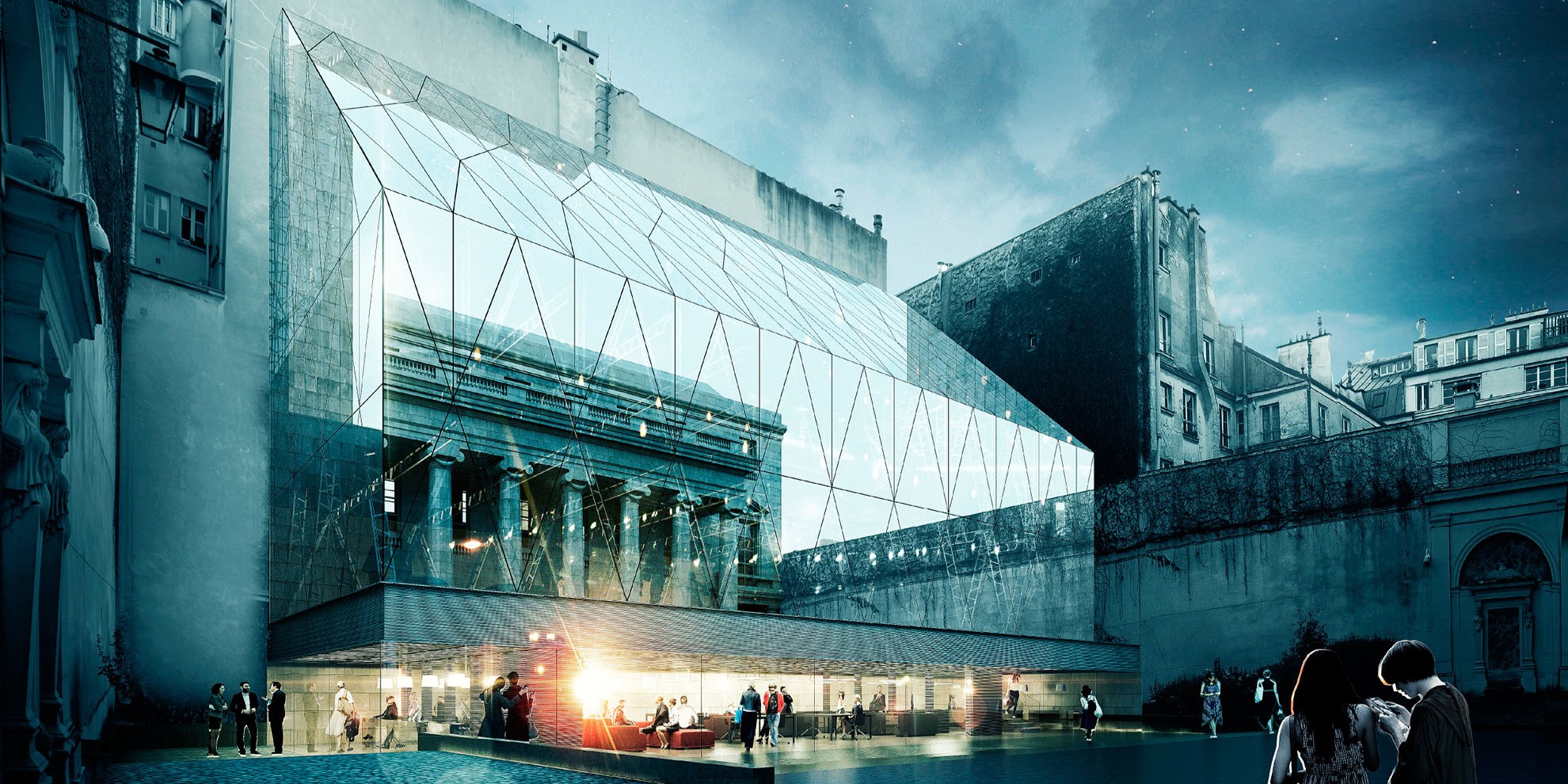 The project puts the aesthetics of the headquarters of the Italian Cultural Institute at the center, designing two architectures that redefine the relationship with the surrounding space occluded over time by the saturation of the blocks of Rue de Varenne. While the east wing tends to dematerialize, reflecting the main façade of the eighteenth-century palace built on the land of the Bolognese Talon family, the south wing is defined by material iron ribs that pierce the ground and gravitate towards the sky.