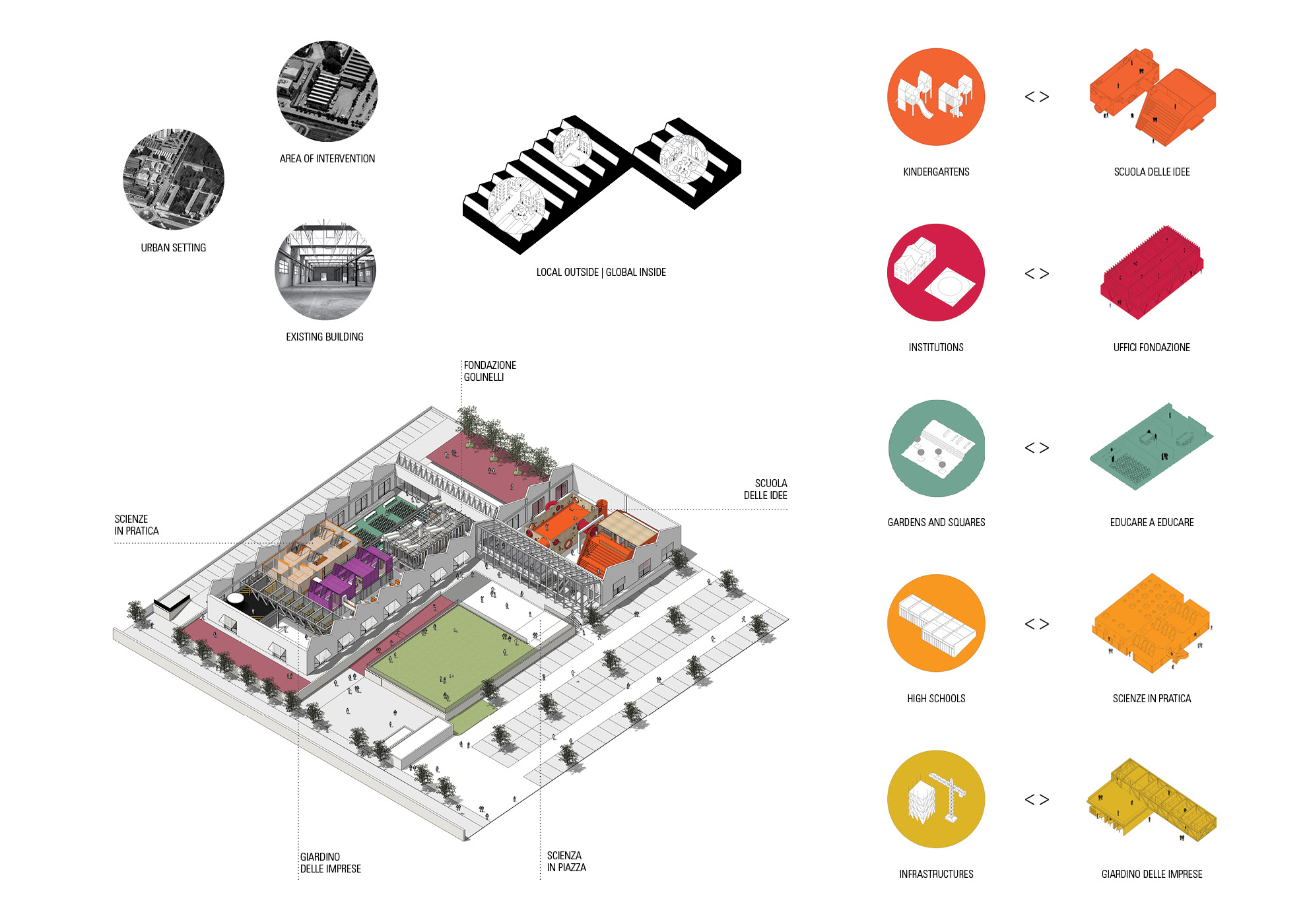 The aim of the project is to educate students about the scientific component of art and the artistic intuition of science. The Opificio is conceived as a metaphor for the city, in which all the activities with a daily program take the form of mnemonically recognizable landmarks which, together with the “public space” in the door intended to host temporary and multifunctional activities, creates a hybrid and heterogeneous use.