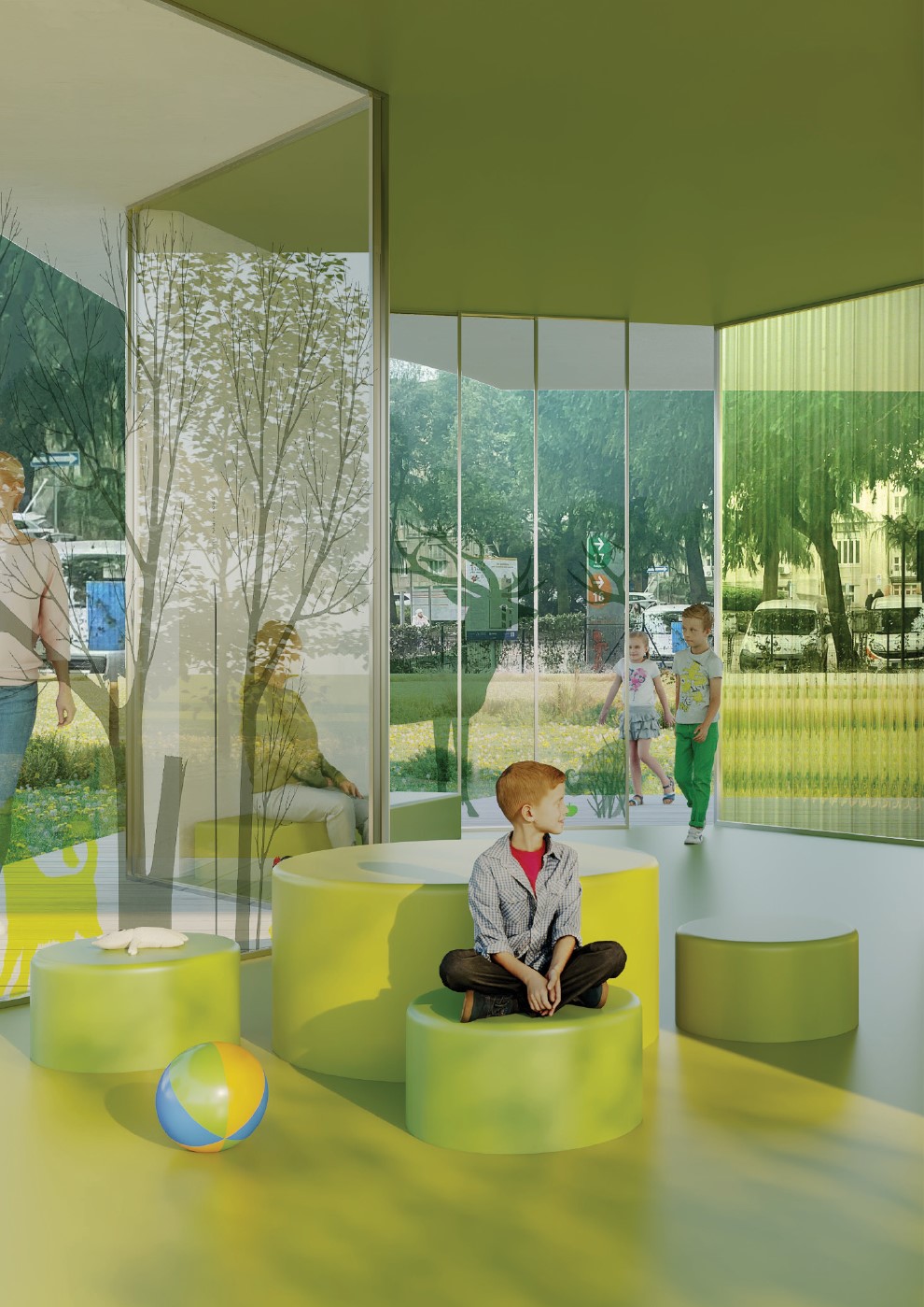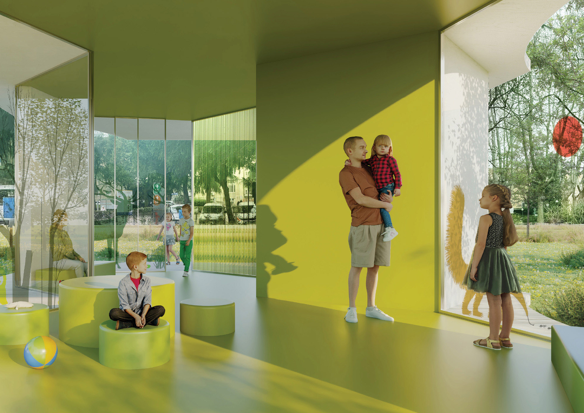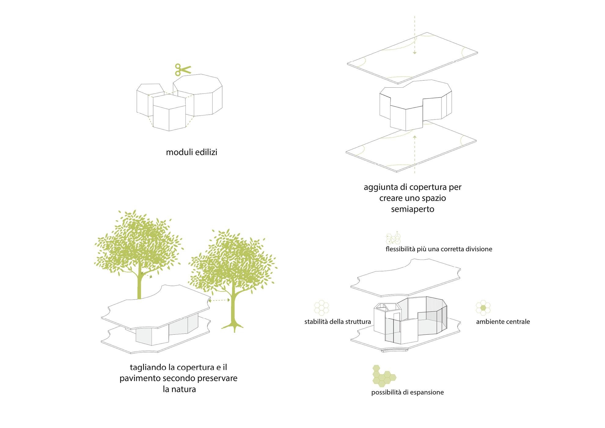 Un padiglione di soli 40 metri quadri per bambini degenti, suddiviso in due ambienti che potranno anche diventare un unico grande spazio. L’idea dell’allestimento è quella di assimilare la forma del padiglione alla forma dell’alveare, il nido naturale dove vivono le api creando uno spazio di frontiera che confonde natura e architettura.
