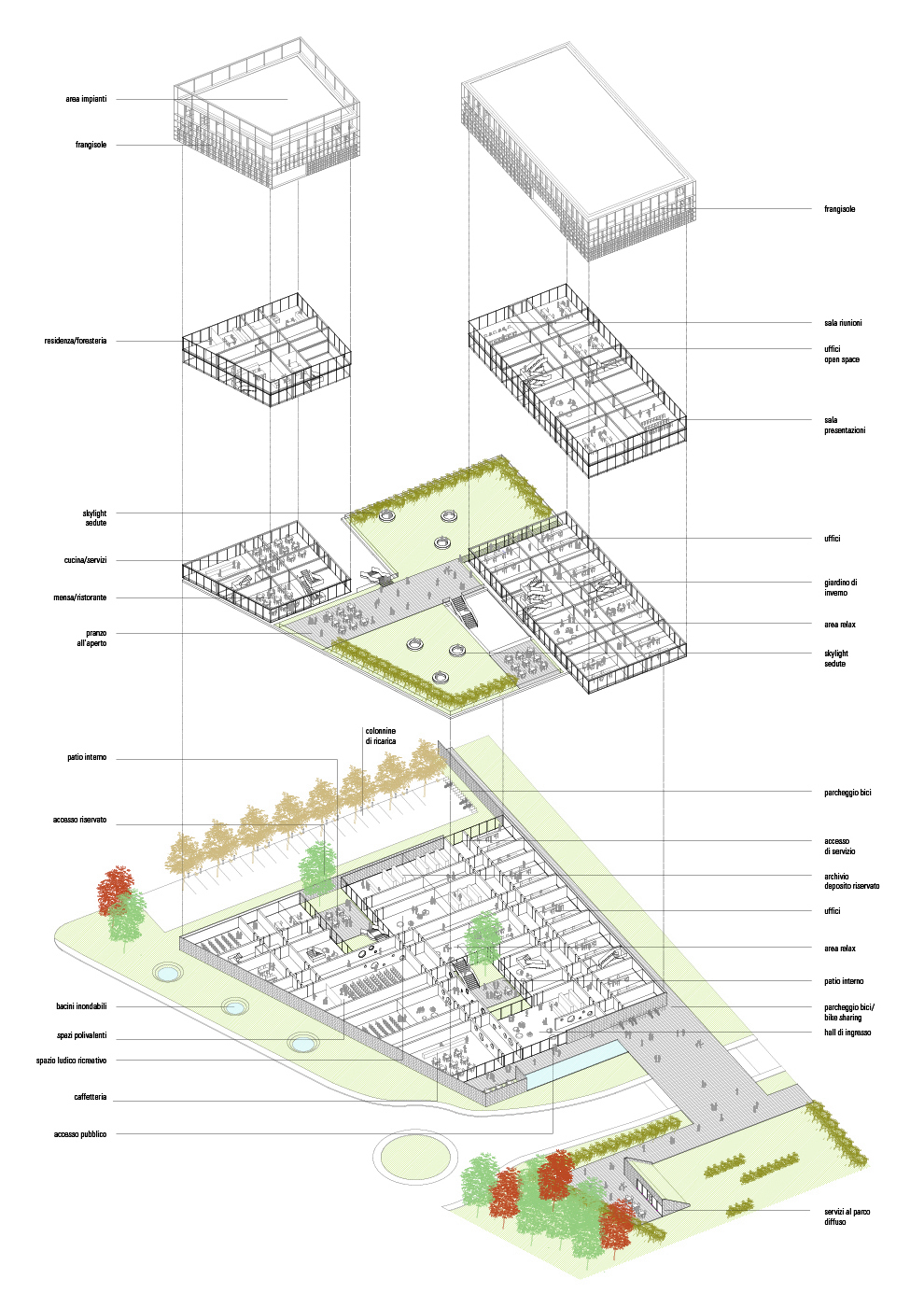 Urban regeneration intervention in the former barracks area, designed for Cassa Depositi e Prestiti and the Ministry of the Interior together with ARCHISAL Studio Salmoni; the important building that will host the program of the new Macerata Police Headquarters is imagined according to a model of aesthetic climax that can be replicated at a national level.