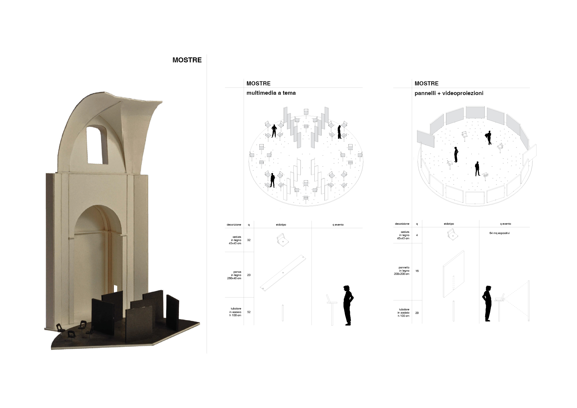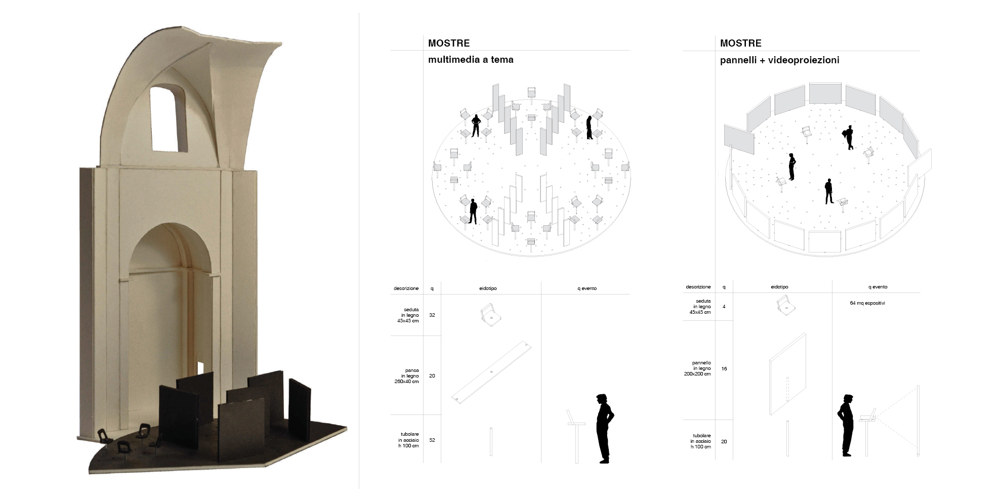 The project recovers parts of the Church of Sant’Apollonia, giving it a different use: from a place of worship to a space for temporary activities, from adults to children. In an ideal relationship between figure and background, mobile devices are inserted in the monumental spaces of the main nave, which currently appear bare, adaptable and reconfigurable in multiple scenarios.